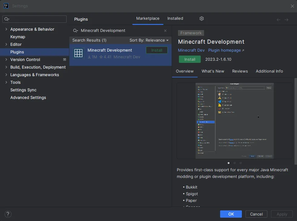 Section titled “Installing the Minecraft Development plugin”